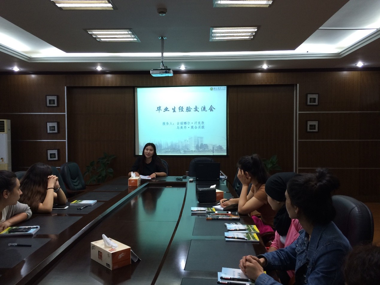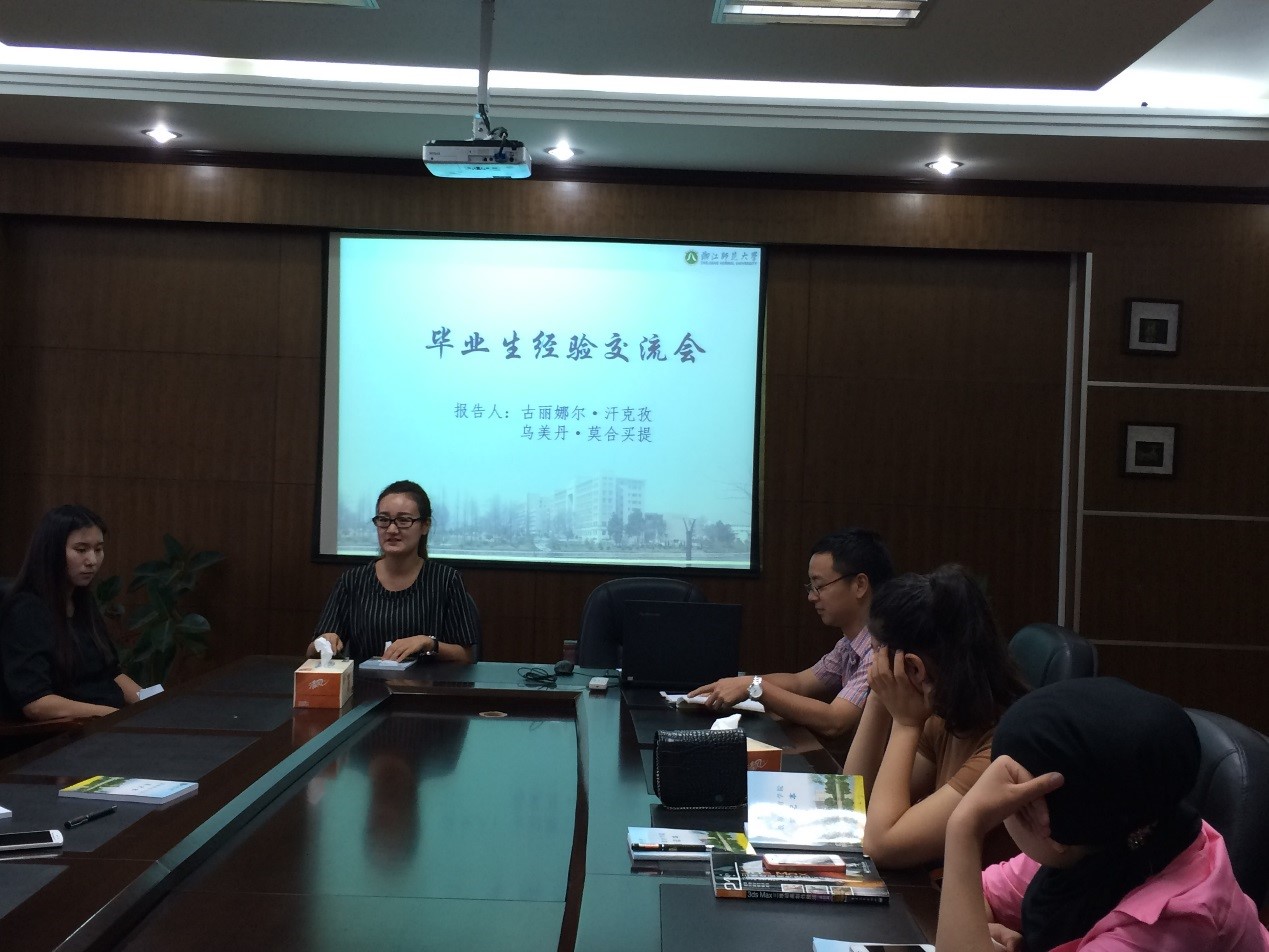 5月14日,我院少数民族同学毕业交流会在17幢401会议室举行,交流会邀请到两位优秀的2015届毕业生古丽娜尔·汗克孜、乌美丹·莫合买提为同学们做经验交流。学工办主任李恒老师、辅导员赵丽娜老师参加本次交流会。