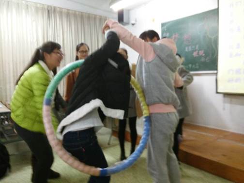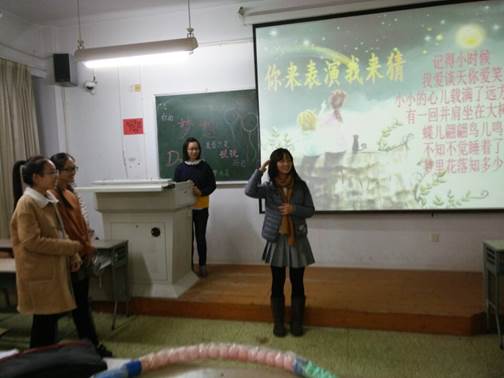 班会是从游戏环节开始的,第一个游戏叫做“你来表演,我来猜”。游戏规则非常简单,就是一个人提问,一个人表演出自己小时候和现在的梦想,一个人猜。第二个游戏是“一路有你”,每组有4-5个人手拉手围成一个圈,然后让呼啦圈在队伍间迅速的传递并计时,同学们争先恐后地挑战自己的极限,最终以8人20秒的惊人的成绩结束了游戏。这两个游戏将同学们的积极性都调动了起来,现场气氛高涨,笑声连连。
