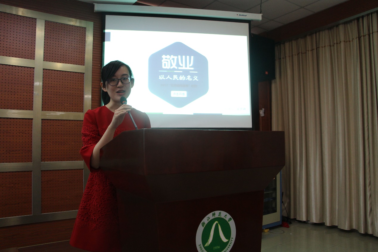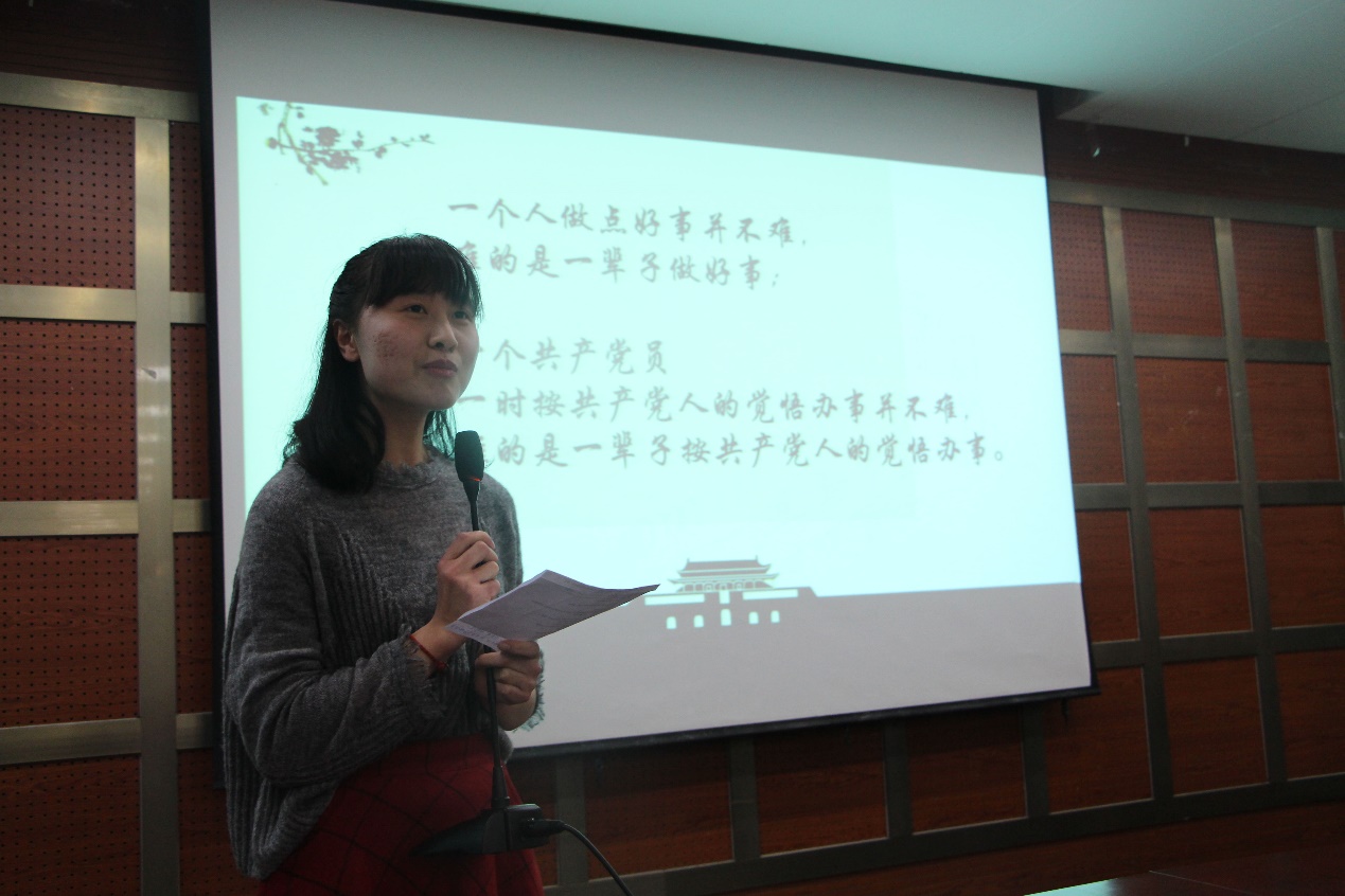 最后出场的孟宇婕同学,一袭红裙,气场十足。她给同学们带来了一堂题为《敬业,以人民的名义》的微党课。孟同学首先列举了热播反腐大剧《人民的名义》中老革命陈岩石老先生“入党就是为了争取一个扔炸药包的机会”的誓言,强调党员的敬业传统。随后,她又列举了“人民好书记”杨善洲坚守绿林,不愿享受应得的干部福利,随家人一起和“8亿农民同甘共苦建设家乡”的故事,以及“支妈妈”支月英36年坚守乡村,将两代乡村孩子培养成才的故事。这些例子充分的展现了共产党人敬业坚守的优良品质和从群众中来,到群众中去工作路线。