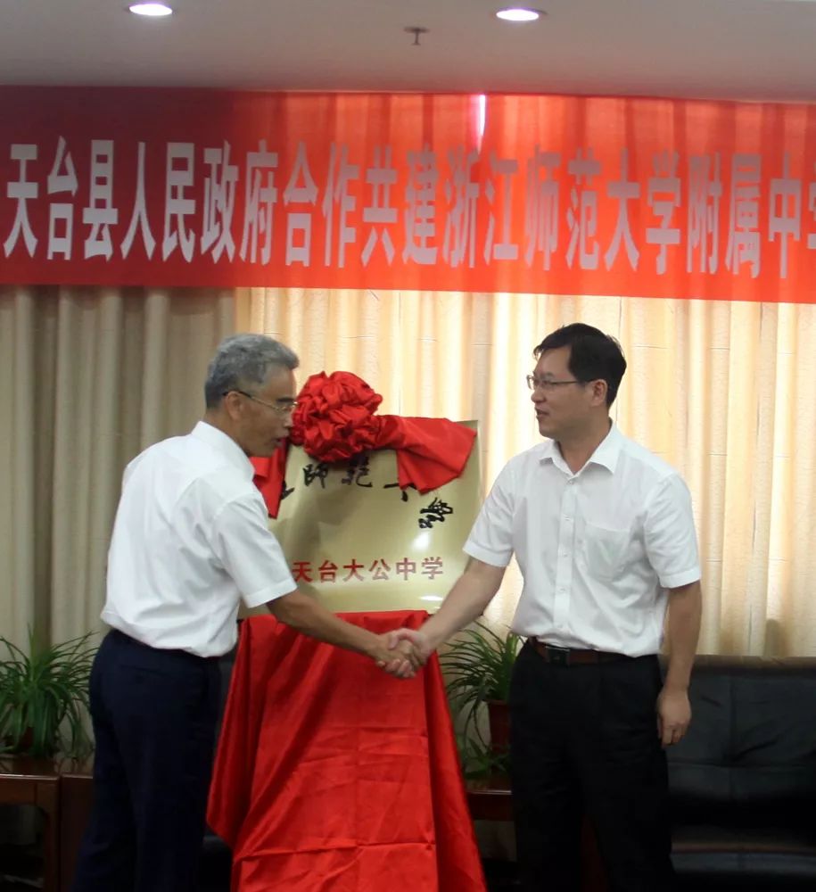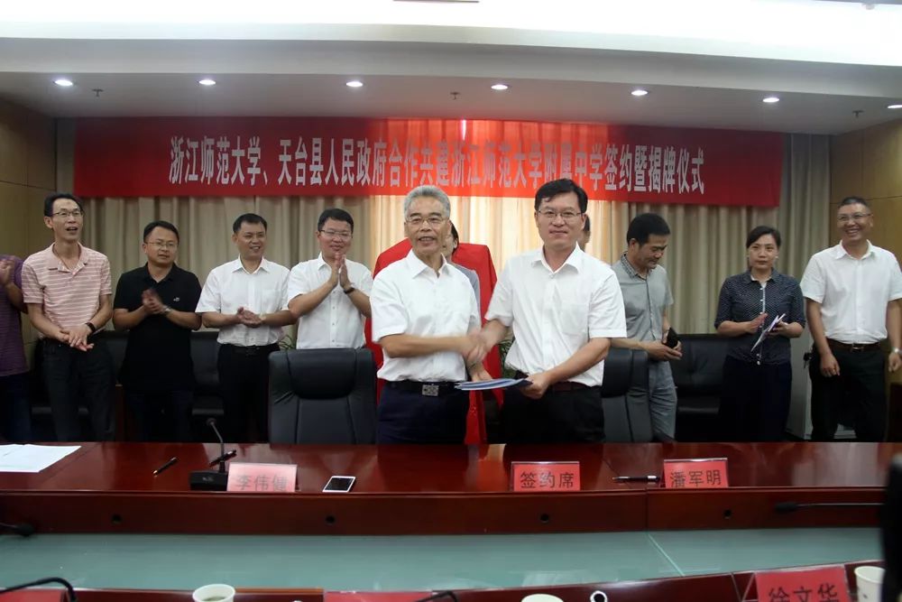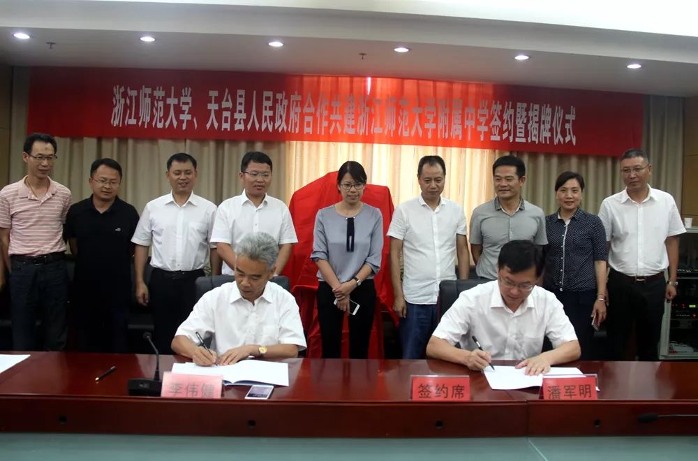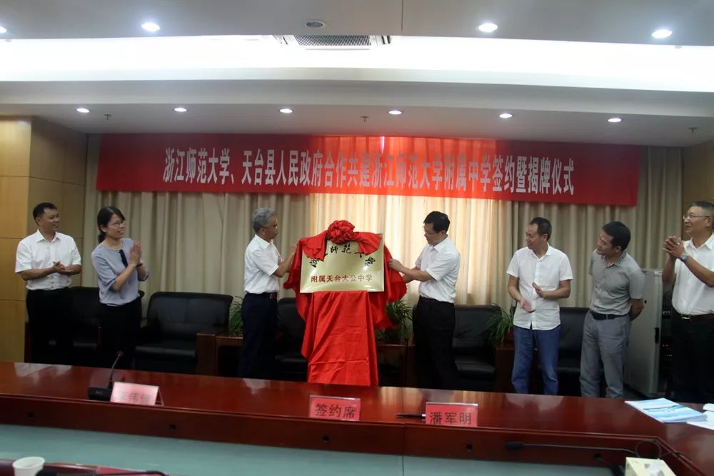 6月27日中午,浙江师范大学、天台县人民政府合作共建浙江师范大学附属中学签约暨揭牌仪式在县行政中心9楼东会议室举行。浙师大副校长李伟健和天台县人民政府县长潘军明在合作共建协议书上郑重签字,并为“浙江师范大学附属天台大公中学”揭牌。活动由副县长倪海燕主持。