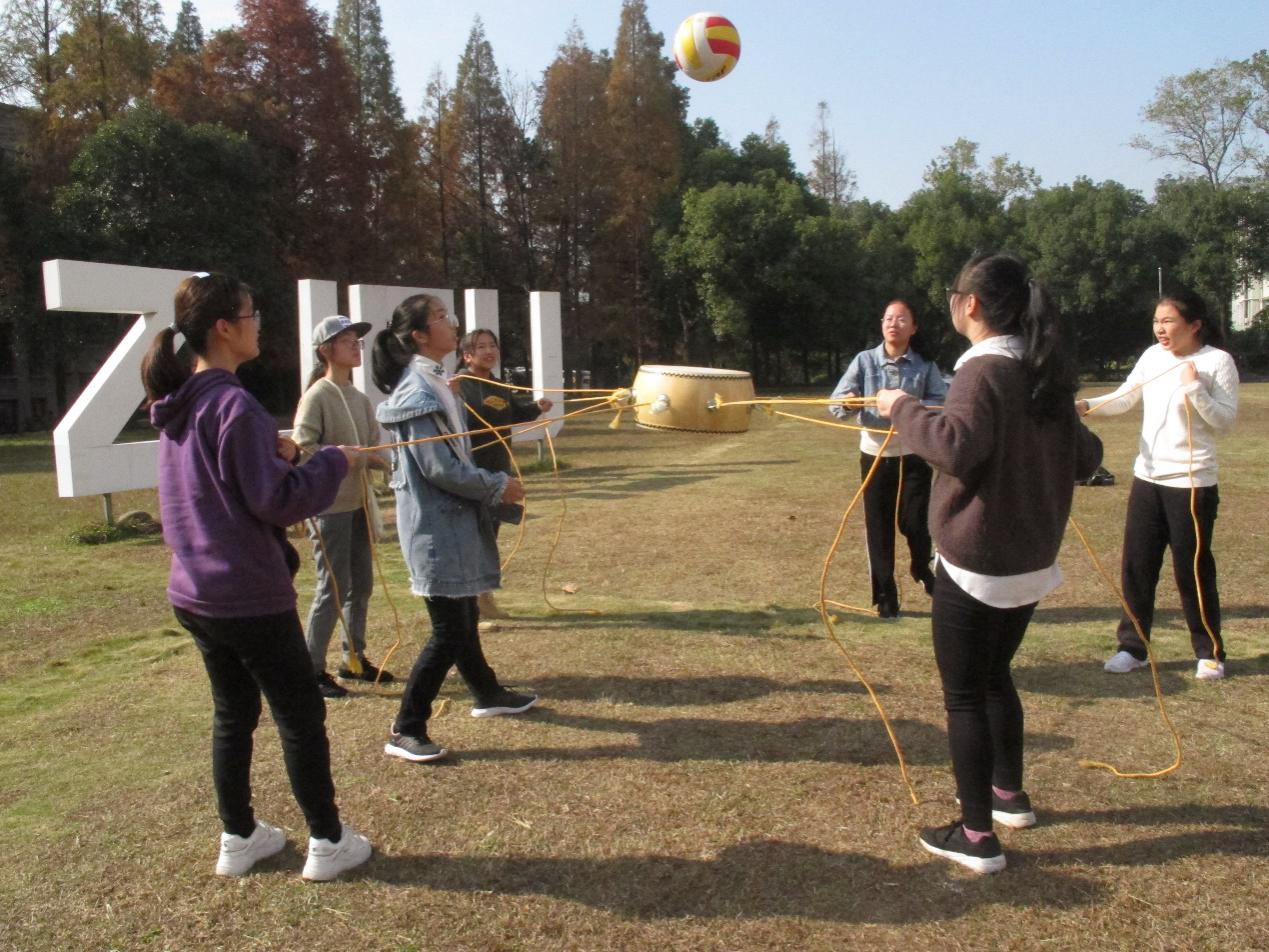 “咚咚咚咚——”排球在“同心鼓”上不断起落,同学们手中的绳一紧一松,击奏出了青春的旋律。“雷区取水”则将集体力量展现得淋漓尽致,围成一圈的组员用力拉开麻绳织成的大网,一名同学压身其上,尽力伸展每个关节,在众人力量的支撑下,用指尖够到了沙包,成功通过“仅用一根绳子拿到雷区中间沙包”的挑战。
