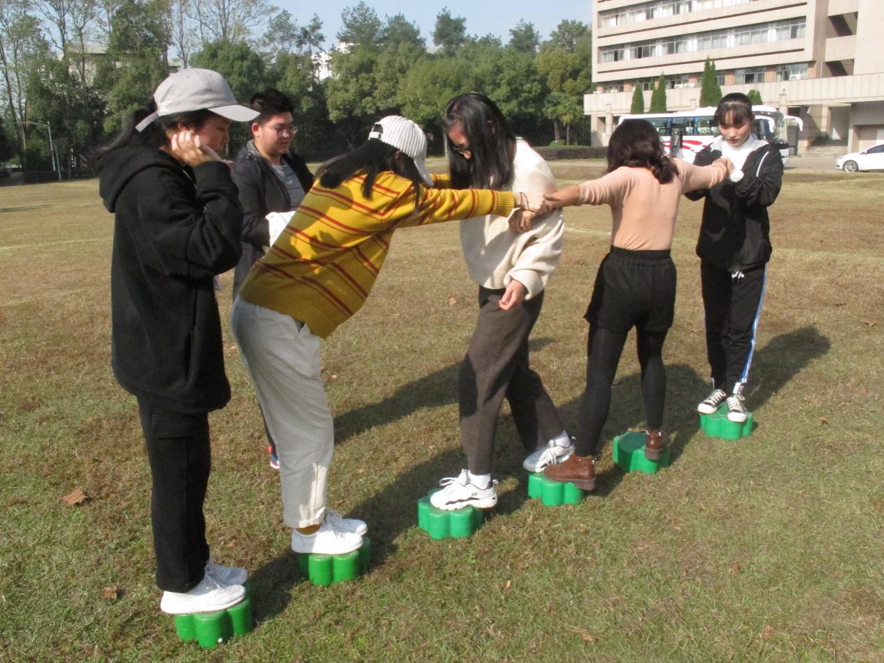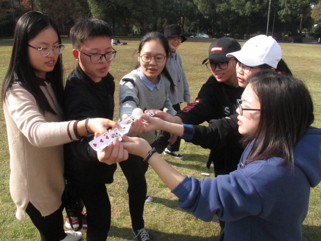 伴随着“一二三放!”的口号,成员们在“不倒森林”游戏中不断磨合,从最初此起彼伏的杆子倒地声到后来无声而又精准的交接,配合默契的他们树立了一片不倒的“森林”。面对同样需要默契的“纸牌传球”,同学们排成两列,井然有序地搭着纸牌,一个接一个,将承载着团结的小球送到了终点。