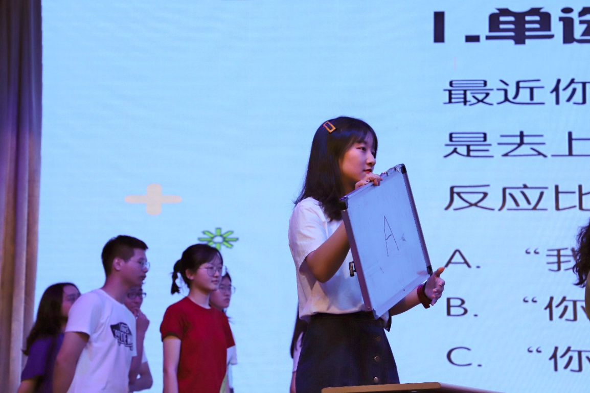“绘·知海蓝图”拉开了心理知识储备实时比拼的帷幕,六个团队一同答题,成员轮流作答。“最基础的心理防御机制?”“图片中的组织名称是?”……教育学子面对开头选择题显得游刃有余,连下六题,但受限于偏僻难题,十二题过后还余一人,在此环节拿下7分。