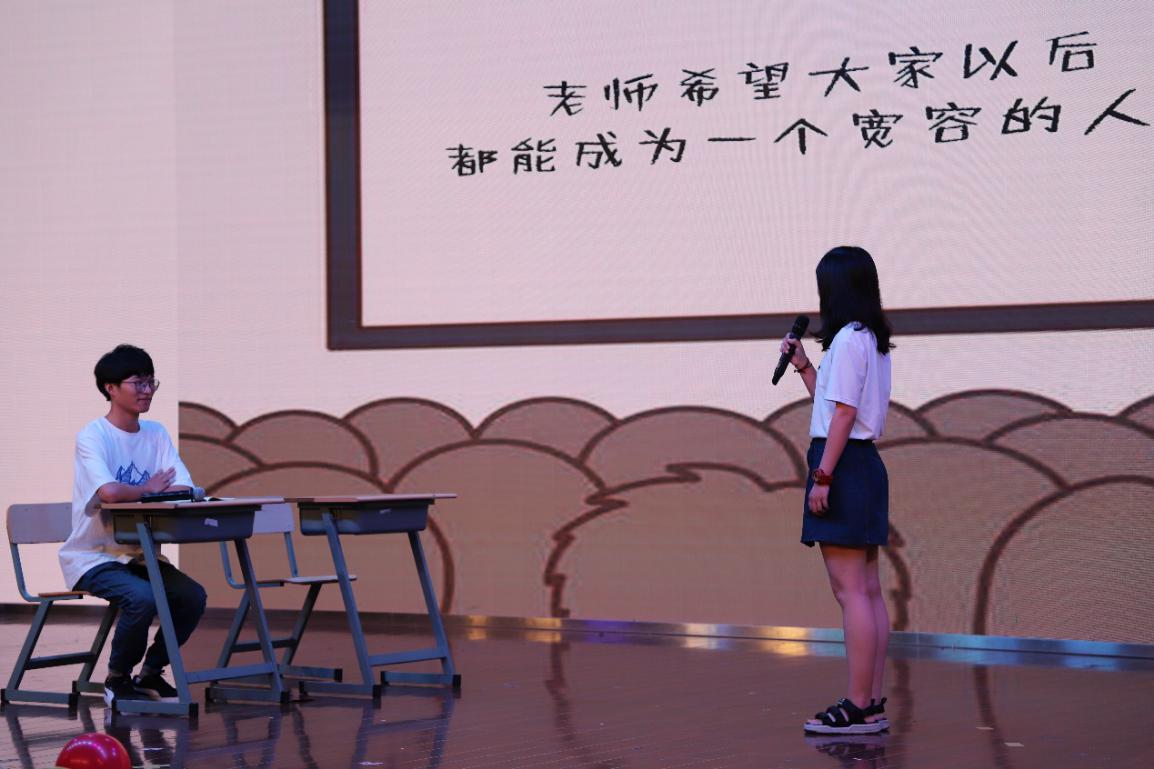 “绎·成长梦想”旨在通过情景剧的方式展现关键词内涵,我院选手从生活实例入手,结合“送水阿姨”与“见习日常”,构造了一个关于“宽容”的故事,主人公一开始对送水阿姨失职的愤懑,阅读学生关于宽容主题作文时的释然,偶遇送水阿姨被感谢时的触动,一系列有层次的情绪变化让观众们沉浸其中,得分88.83分。