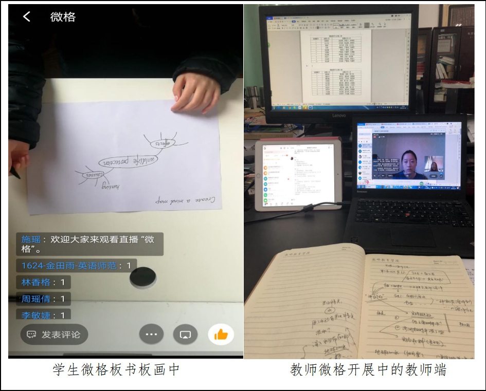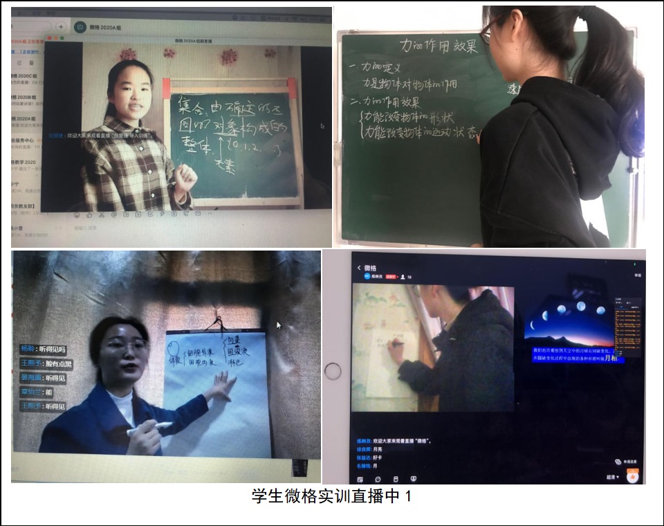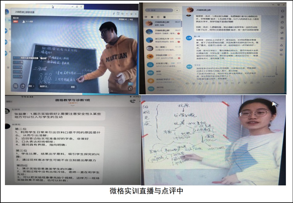 在这种模式下,我们的学生是怎样开展实训的?我们的教师又是如何操作“云端”键盘与屏幕开展实训指导的?从课堂中拍下的照片来看,每位同学都极为珍惜这“云端”特殊时期的实践机会,每位学生努力创造微格教室实训的条件,将自己的家、卧室布置成实训小环境;电脑、电视机(投屏)、手机共同使用,就是为了创造更好的演示效果;购置小黑板、白板或大尺寸的白纸,是用于板书之用。课堂教学离不开学生,线下的微格课堂还有自己的同学充当听课的学生,那居家在线实训怎么办呢?你能想象分别有将妈妈、妹妹(弟弟)叫来当学生的那种努力与投入吗?理科教学的训练,“实验导入”是导入技能中一种重要的导入方式,如何利用技术将真实实验过程展示出来呢?学生们努力了、做到了,取材于生活实际、设计趣味化实验,将实验的过程呈现于网络另一端多个屏幕。微格实训除了学生当主播的直播之外,还需要有听课的同学针对直播同学教学展示进行点评与分享,如何达到面对面的点评的效果?实训过程中有提前分组直接连麦主播的点评,也有通过记录与文字的点评,还有教师通过连麦或视频会议针对每位同学的具体点评,可不实训指导教师们估计也用多台电脑并用的多频环境,随时记录着,就怕漏掉学生的精彩。
