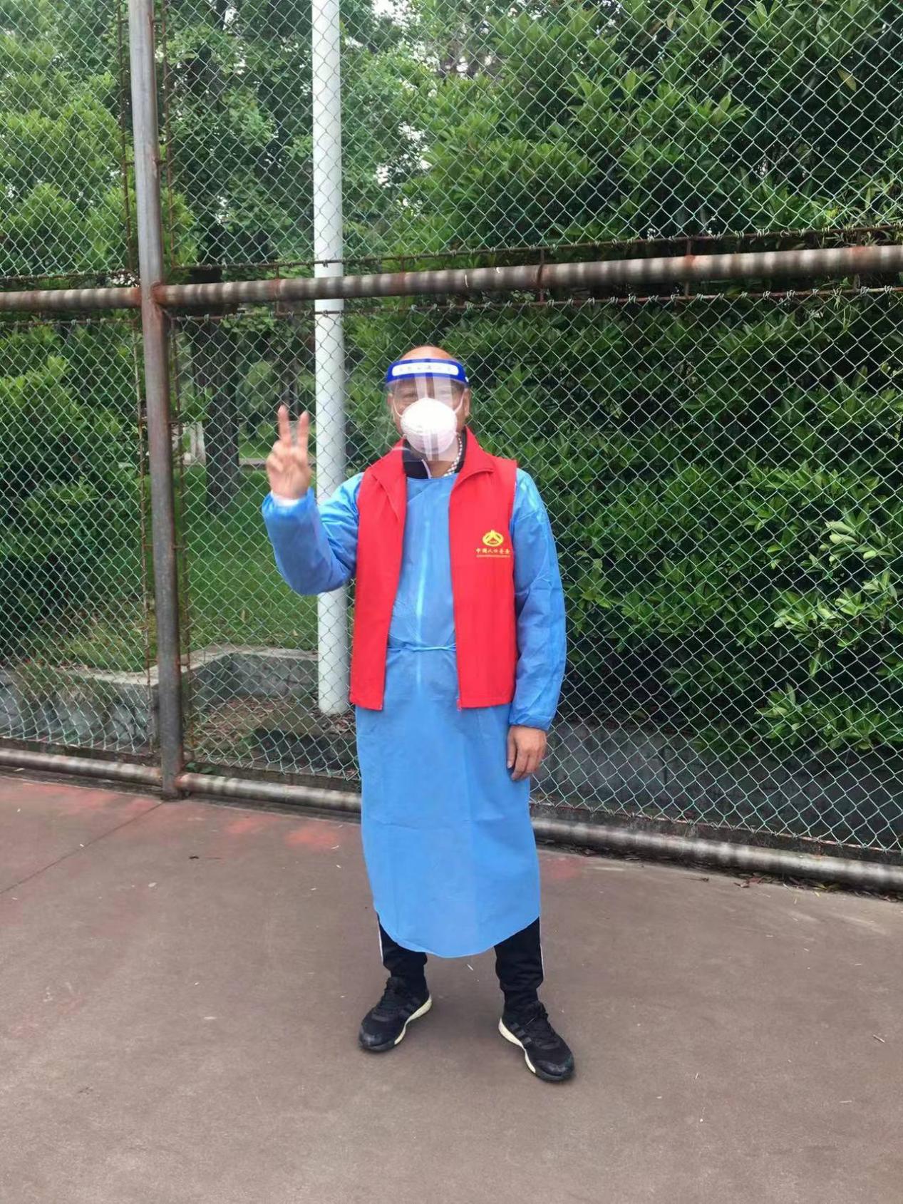 图为教育学系教师党支部成员郎建胜、退休党员傅宝英投身社区防疫工作