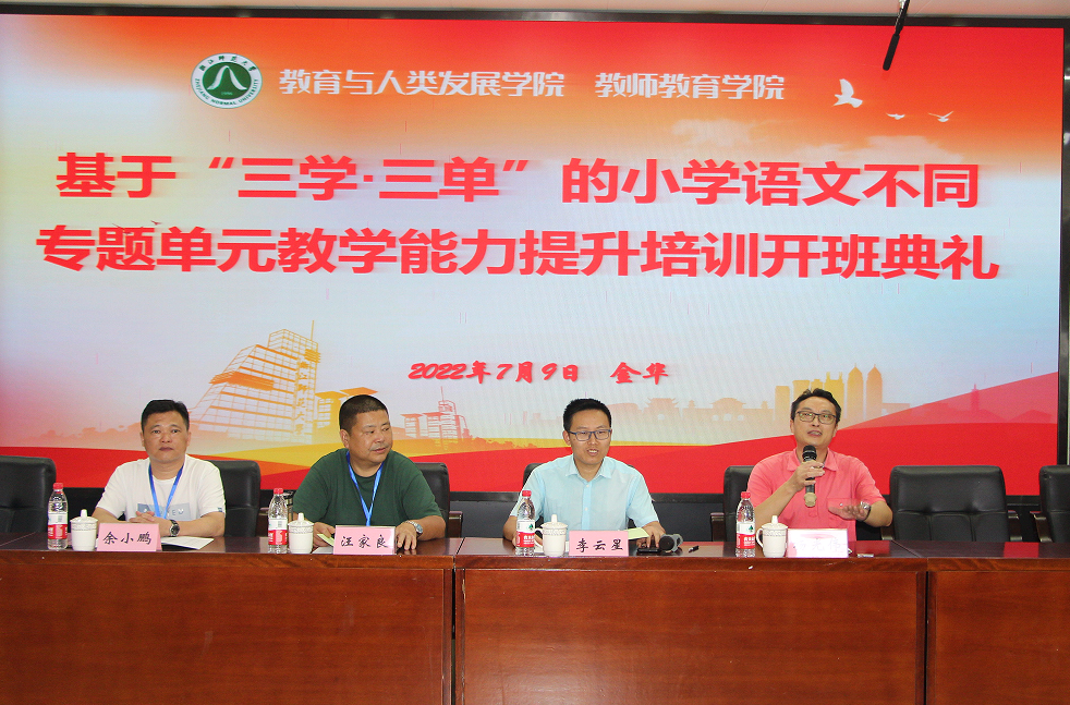7月9日下午一点,浙江师范大学江南娱乐app网站官网 学院举办了基于“三学·三单”的小学语文不同专题单元教学能力提升培训的开班典礼,江南娱乐登录测试 院长助理李云星、衢州市开化县研训中心副主任汪家良参加开班典礼并讲话,开班典礼由江南娱乐app网站官网 学院社会服务中心主任杨光伟主持。此次,开化县117名小学语文骨干教师参加培训。