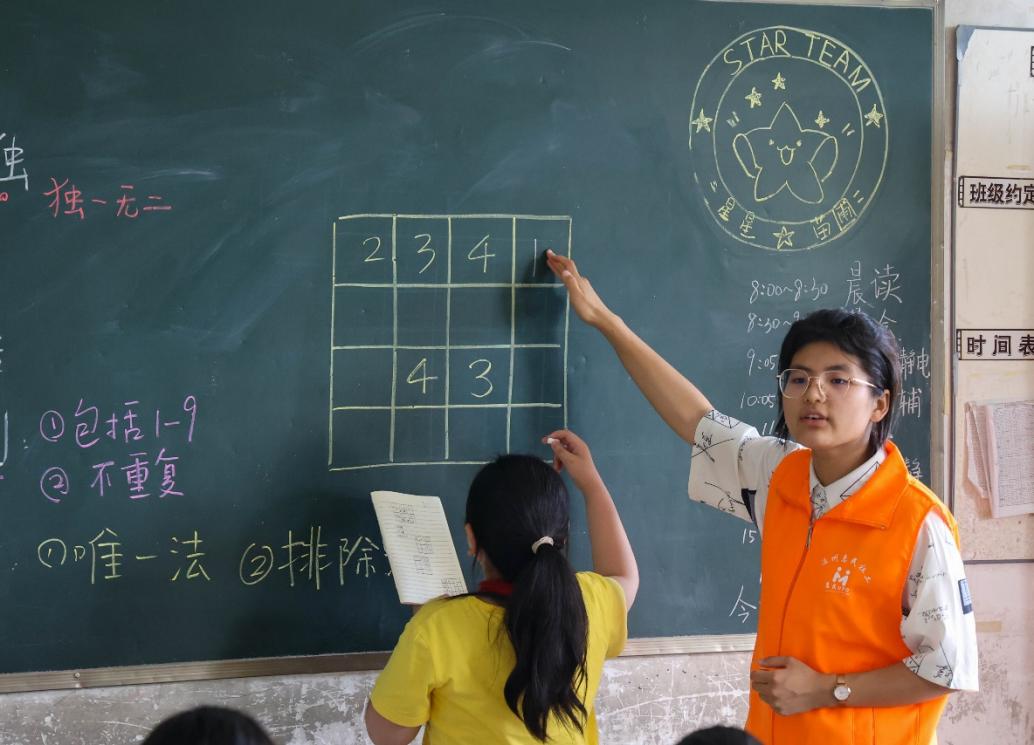 数独,作为一种有效锻炼大脑提升心智的游戏,被纳入了“携爱”实践队此次的趣味数学课堂之一。余凯欣从数独起源、相关术语以及游戏规则等角度娓娓道来,以一种平易的方式介绍这一趣味性十足但又“高深莫测”的“头脑风暴”。同学们在看似简单的九宫格中体会逻辑推理和创新思维的魅力,感悟游走在成功与失败一线间的滋味。他们眼中熠熠生辉的光是他们对未知、对挑战满满的好奇与探索。