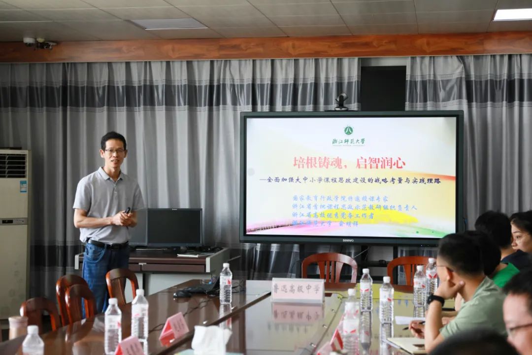 俞明祥书记作了“培根铸魂、启智润心——全面加强大中小学课程思政建设的战略考量与实践理路”的专家报告。他从党的二十大报告出发,重点阐释了习近平总书记的相关重要论述,系统梳理了全面加强课程思政建设的理论逻辑和发展演进过程;他指出,落实学校立德树人根本任务的战略举措、坚持社会主义办学正确方向的重要要求、从“教书匠”到“大先生”的升华路径、形成高水平人才培养体系的必然要求、加强改进学校思想政治工作的迫切需要,“为党育才,就要把党的声音转化为最有营养的课程。”他强调,高校课程思政与中学学科德育一脉相承、指向归一、学理相通,共同服务于立德树人根本任务;高校课程思政的有效做法和成熟经验完全可以向中小学移植推广,加强大中小学课程思政一体化建设,协同推进时代新人培育工程。针对中小学德育和班主任工作,他引用总书记的“三因论”和“盐论”,指出要注重价值引领、如春在花、如盐在水、润物无声,深耕厚植,绵绵用力,久久为功。他还专门分享了杭州上城区等多个立德树人典型案例,最后以“教天地人事,育生命自觉”与大家一起共勉。
