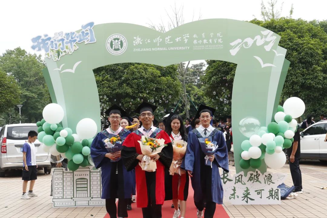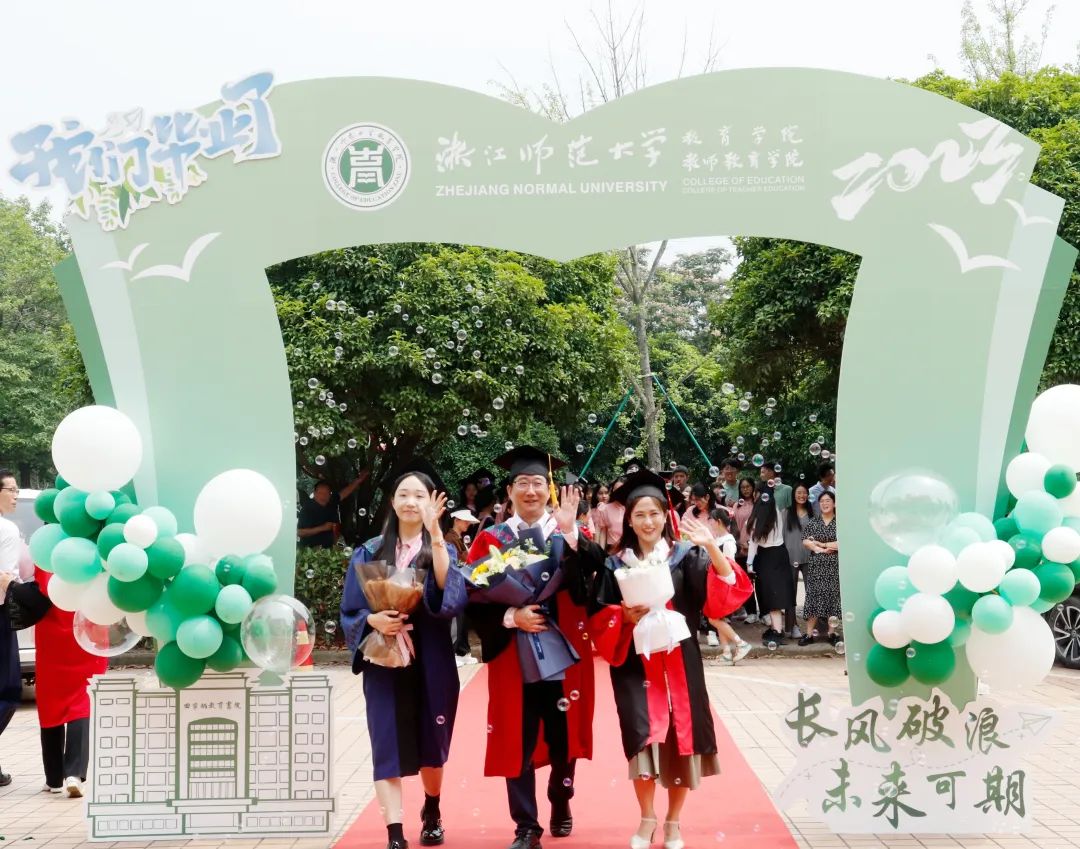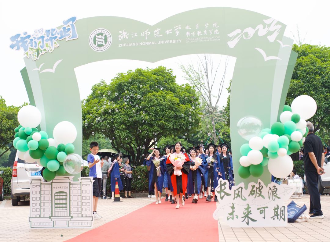 毕业生们在导师、班主任的带领下走上红毯,跨过教育之门,并在笑脸墙前合影留念。恩师、挚友、他们,无数的欢笑与泪水,皆收录进一本名为“青春”的诗集,记录着大家的成长与收获。场内《栀子花开》MV循环播放,大家共忆在师大的点点滴滴。