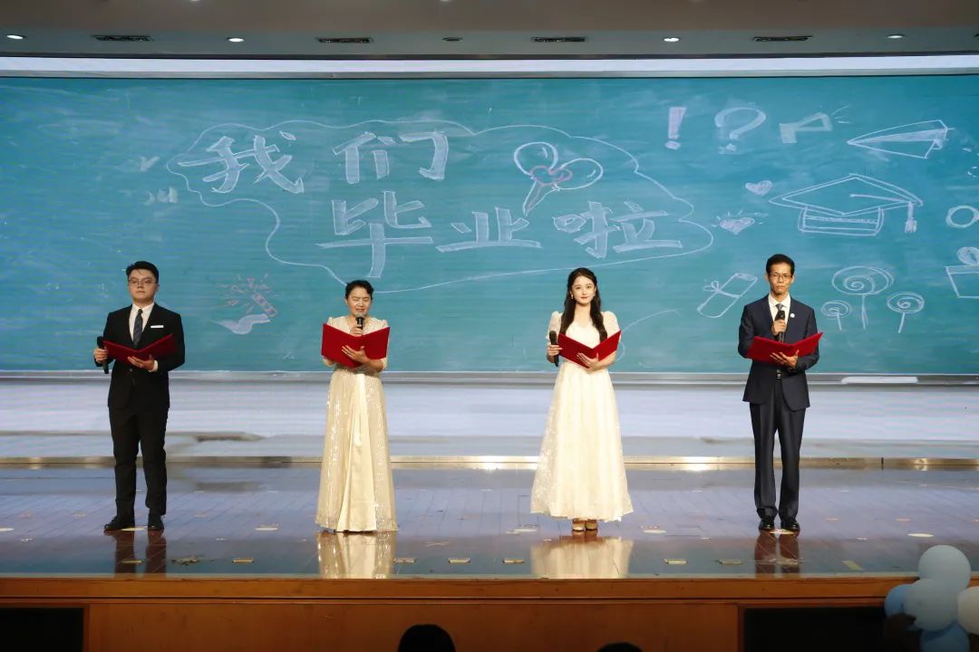 俞明祥老师、黄良英老师和张矿同学、沈瑶同学一起朗诵原创作品《毕业了,我们不说再见》,细数了2023届教育学子的各种精彩,表达了浓浓的师生情、同窗情、离别情。