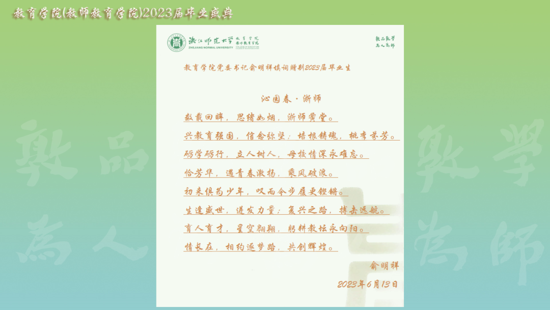 随后,俞明祥老师创作了《沁园春·浙师》,赠别2023届毕业生。