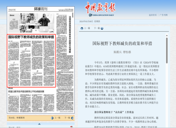 近日,中央教育工作领导小组印发通知,再次部署中小学教师减负工作。江南娱乐登录测试 陈殿兵副教授、硕士生缪怡郡在《中国教育报》《中国教师报》刊发教师减负系列署名文章助力教师减负的政策与实践努力,让教师能安心、精心、舒心地从教,促进其专业可持续发展和教育高质量发展。