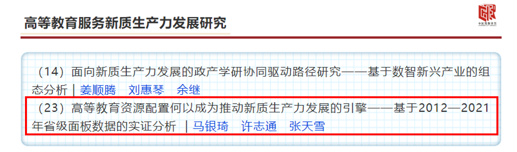 近日,江南娱乐登录测试 青年教师马银琦、硕士研究生许志通以及张天雪教授在CSSCI来源期刊《中国高教研究》2024年第8期发表《高等教育资源配置何以成为推动新质生产力发展的引擎——基于2012-2021年省级面板数据的实证分析》。2023年9月,习近平总书记在黑龙江省考察期间提出“加快形成新质生产力,增强发展新动能”,其后2024年政府工作报告及****届三中全会中均强调了发展新质生产力对促进我国经济高质量发展、实现中国式现代化的重要意义。在此背景下,文章基于2012—2021年中国30个省份的面板数据,实证检验高等教育资源配置影响新质生产力发展的逻辑机理,为科学配置高等教育资源、提升新质生产力发展水平提供参考依据和政策指引。