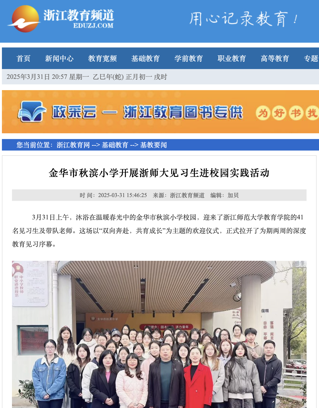 3月31日,浙江教育频道网站报道我院小学教育专业2022级学生赴秋滨小学见习活动。当日,41名同学在带队老师的带领下,前往金华市秋滨小学,开启了为期两周的深度教育见习。