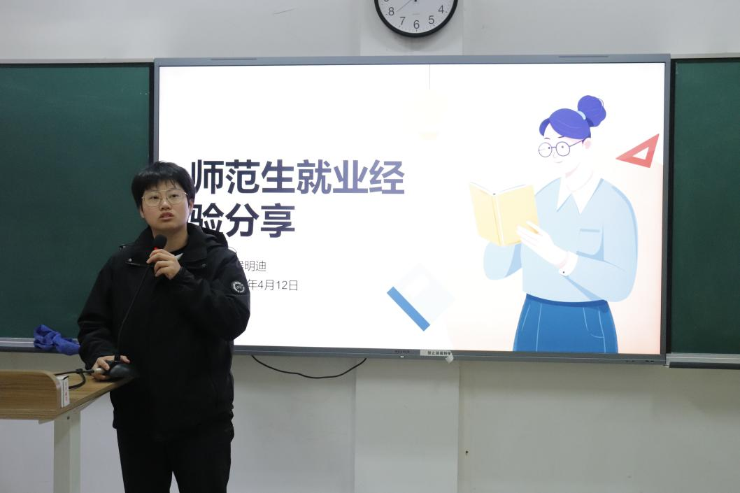 侯明迪从“就业环境分析”入手,结合2025年全国教育工作会议精神及教育事业发展统计数据,分析了当前我国各教育阶段师资需求的变化趋势,并解读了未来教师岗位的机遇与挑战。针对“升学和就业”的选择,侯明迪通过真实案例对比,分析了不同路径的优势与适配性,强调“应选择自己感兴趣和擅长的方向”,建议同学们跟随榜样人物,激发内驱动力。此外,她还分享了“国家大学生就业服务平台”“高校人才网”等实用的就业网站和工具,帮助同学们精准定位职业需求,提高求职效率。