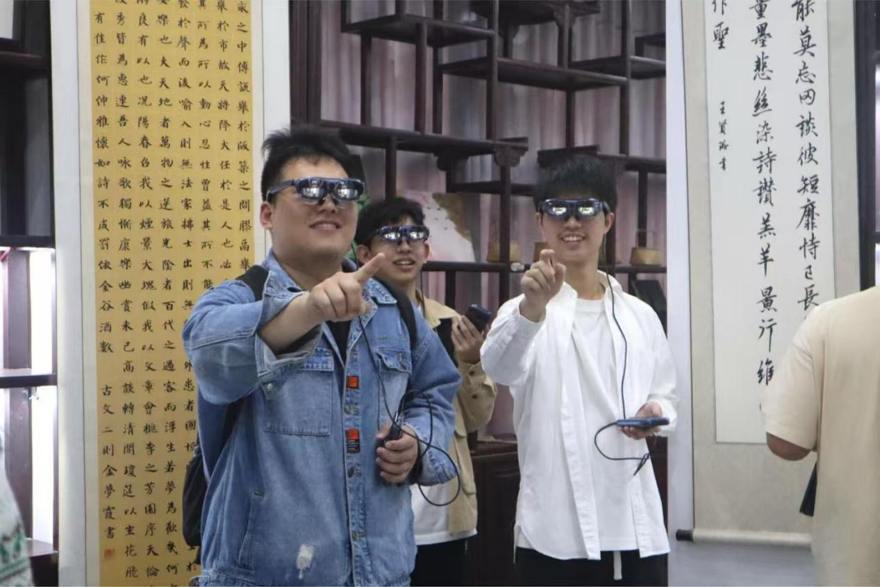 活动最后,同学们走进AR创新实验室一探究竟。作为承载未来教育理念的创新空间,实验室配备了特制的AR眼镜。教师借助这一设备开展沉浸式教学,不仅打破了传统课堂的边界,更以生动直观的教学场景,让抽象知识“跃然眼前”,生动诠释了“技术赋能教育”的现代理念。
