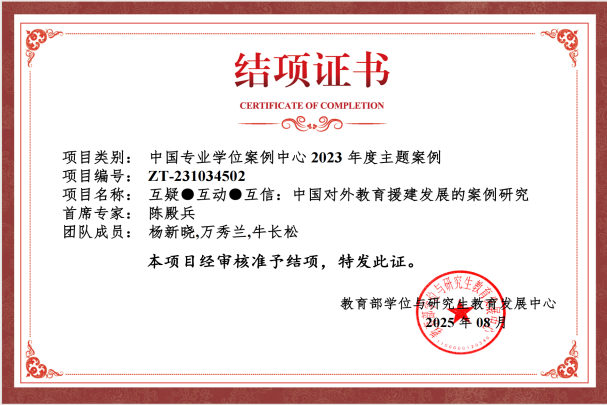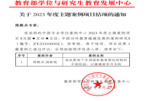 近日,教育部学位与研究生教育发展中心公布了2023年主题案例项目结项通知,教育学院(江南娱乐app网站官网 学院)陈殿兵老师主持的,杨新晓、万秀兰和牛长松老师参与的《互疑·互动·互信:中国对外教育援建发展的案例研究》顺利结项,案例《战乱影响下非洲国家教育规划研制的中国经验:以援建南苏丹为例》通过专家评议,后续按程序收录入库。