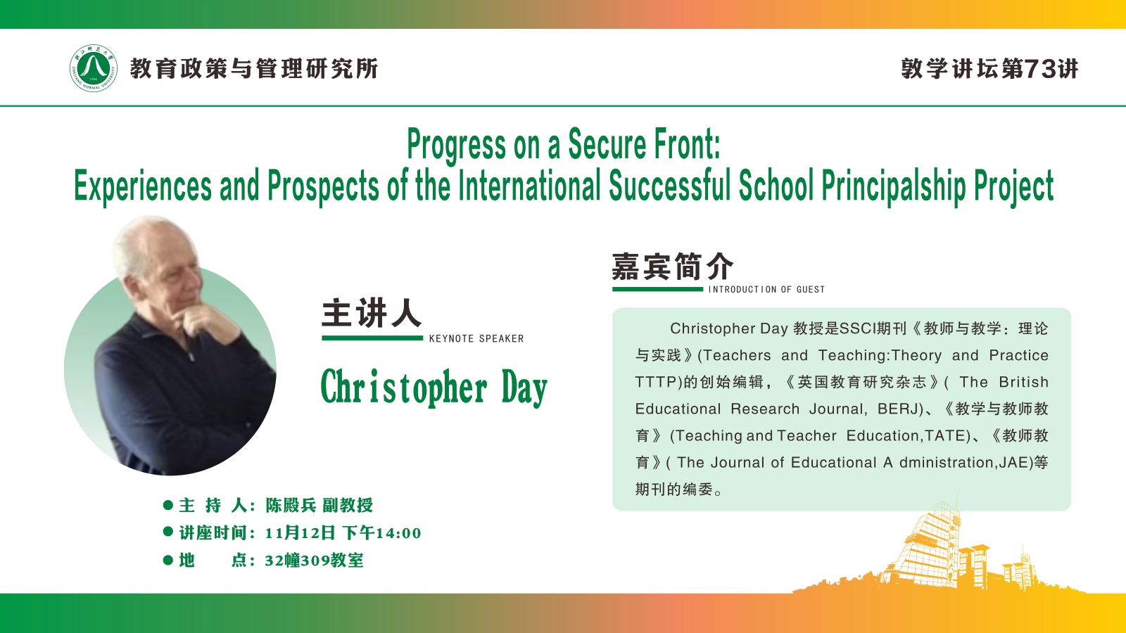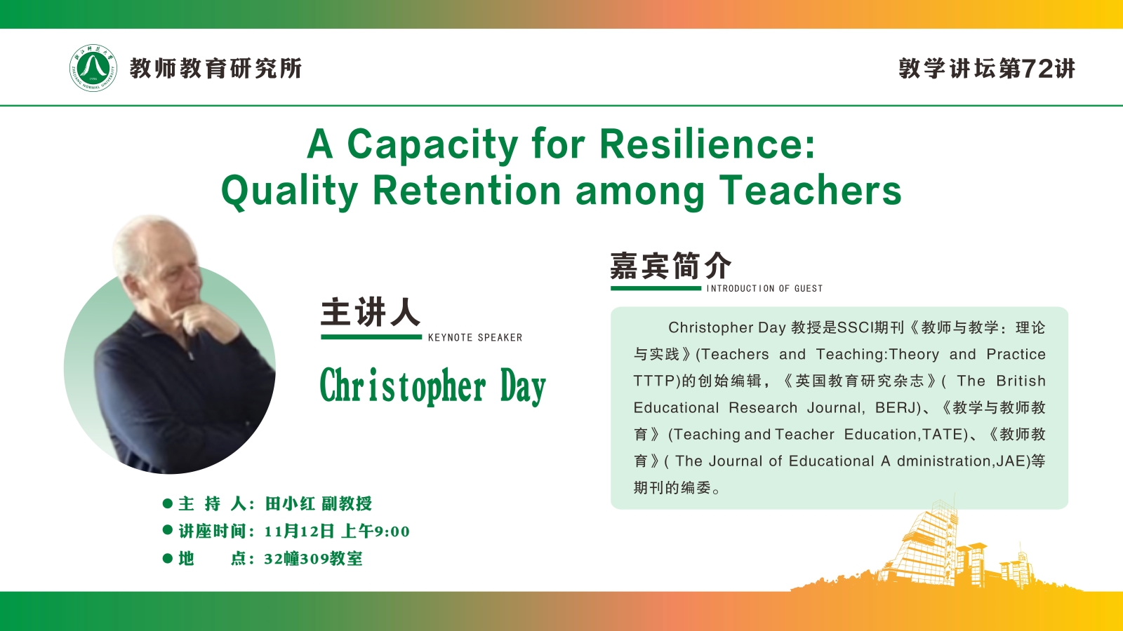 2025年11月12日(周二)上午9:00、下午14:00,英国诺丁汉大学教授、SSCI期刊《教师与教学:理论与实践》(Teachers and Teaching: Theoryand Practice TTTP)的创始编辑Christopher Day教授将于32幢309会议室,分别主讲江南娱乐app网站官网 研究所系列讲座、教育政策与管理研究所系列讲座暨教育学院敦学讲坛第72讲《A Capacity for Resilience: Quality Retention among Teachers》与敦学讲坛第73讲《Progress on a Secure Front: Experiences and Prospects of the International Successful School Principalship Project》,欢迎广大师生踊跃参加!