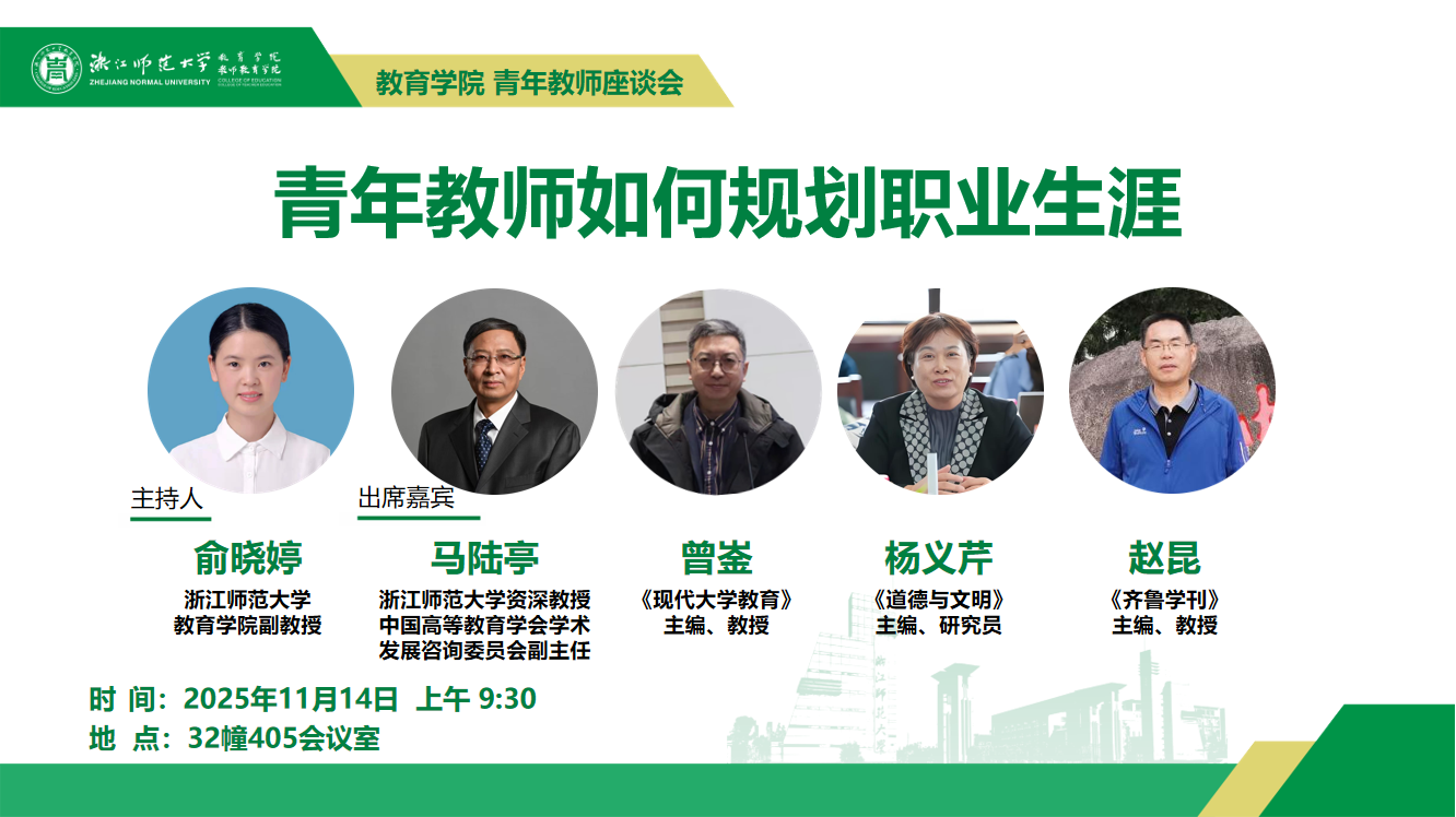 2025年11月14日(周五)上午9:30,浙江师范大学资深教授、中国高等教育学会学术发展咨询委员会副主任兼秘书长马陆亭教授,《现代大学教育》主编曾崟教授,《道德与文明》主编杨义芹教授,《齐鲁学刊》主编赵昆教授,将于32幢405会议室,主讲教育学院青年教师座谈会《青年教师如何规划职业生涯》,江南娱乐登录测试 俞晓婷副教授主持。欢迎广大师生踊跃参加!