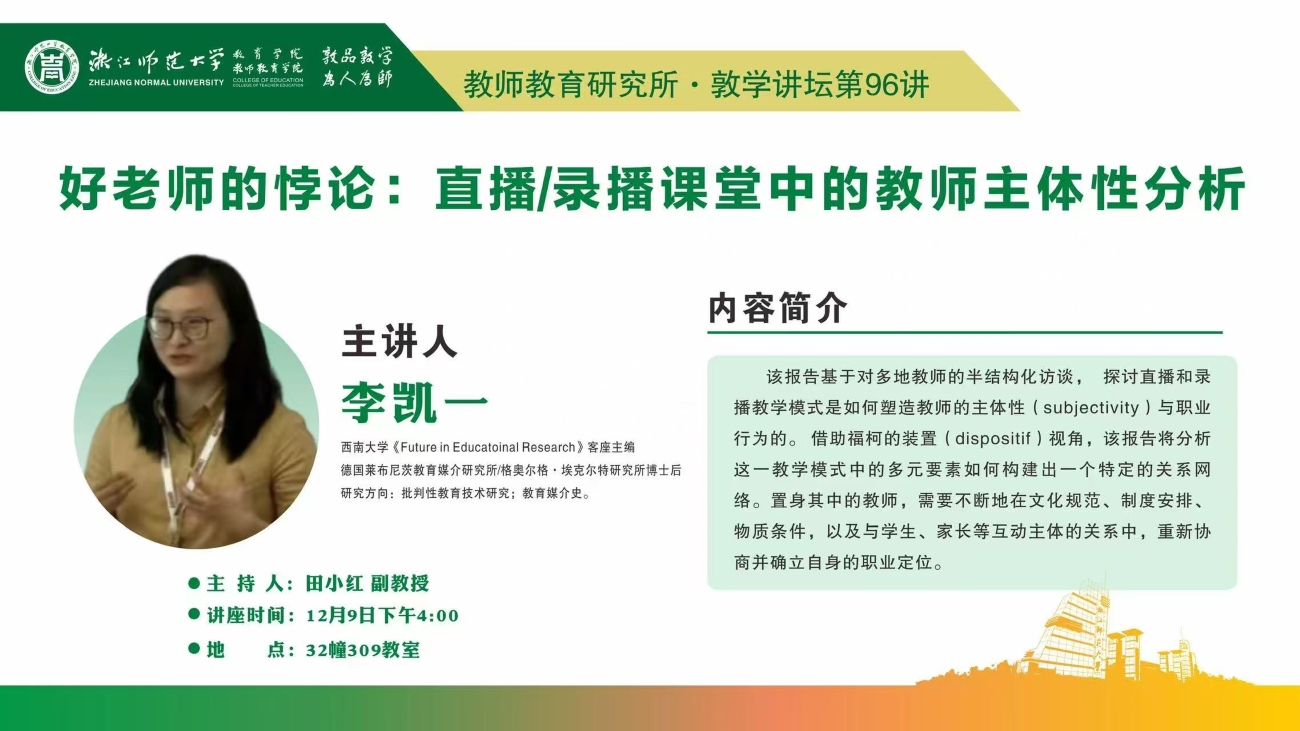 2025年12月9日(周二)下午16:00,西南大学《Future in Educational Research》客座主编、德国莱布尼兹教育媒介研究所/格奥尔格·埃克尔特研究所博士后李凯一主编将于32幢309会议室,主讲江南娱乐app网站官网 研究所系列讲座暨敦学讲坛第96讲《好老师的悖论:直播/录播课堂中的教师主体性分析》。主持人为田小红副教授。