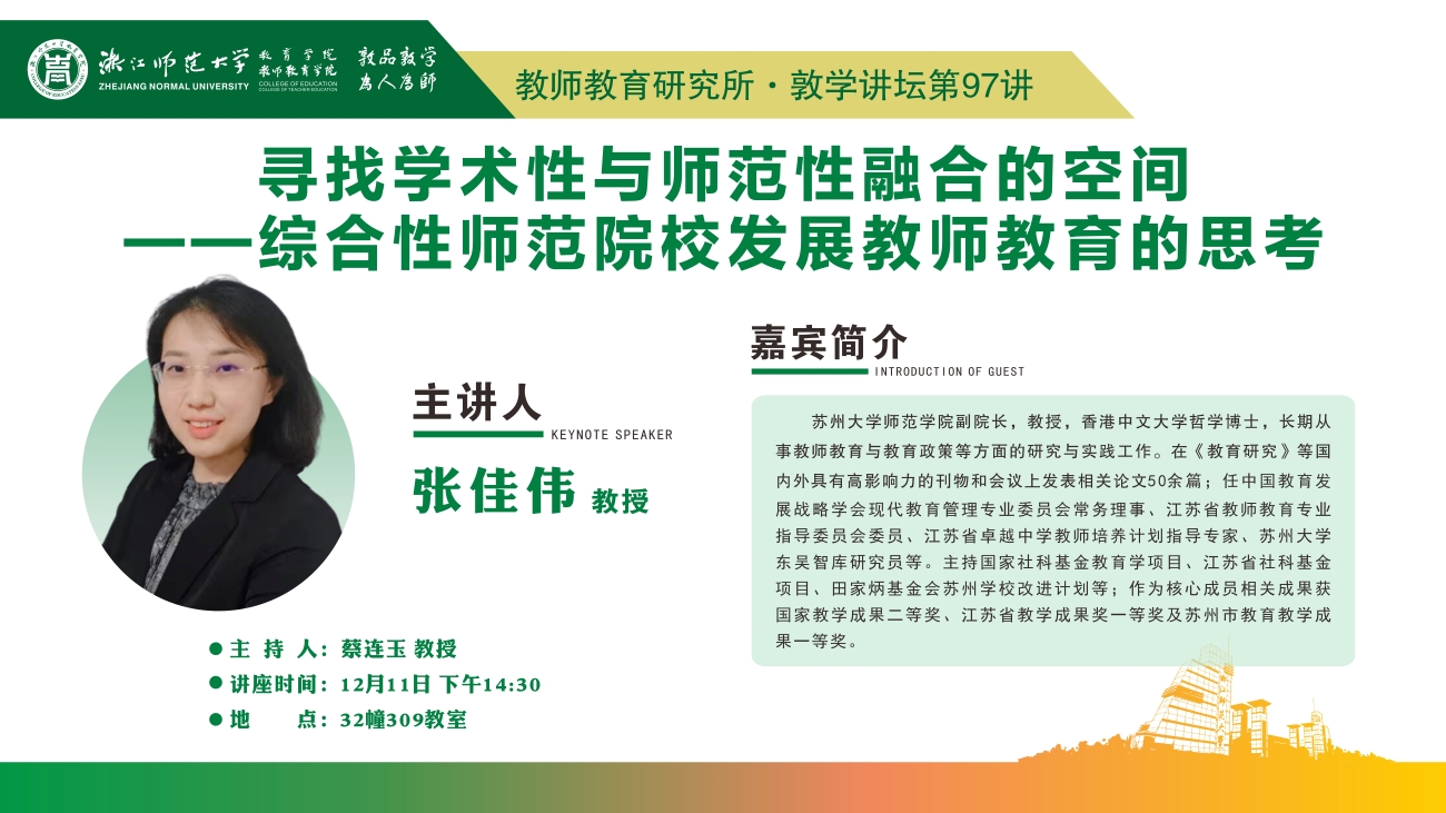 2025年12月11日(周四)下午14:30,苏州大学师范学院副院长、教授,中国教育发展战略学会现代教育管理专业委员会常务理事、江苏省江南娱乐app网站官网 专业指导委员会委员、江苏省卓越中学教师培养计划指导专家张佳伟教授将于32幢309会议室,主讲江南娱乐app网站官网 研究所系列讲座暨敦学讲坛第97讲《寻找学术性与师范性融合的空间——综合性师范院校发展江南娱乐app网站官网 的思考》。主持人为蔡连玉教授。