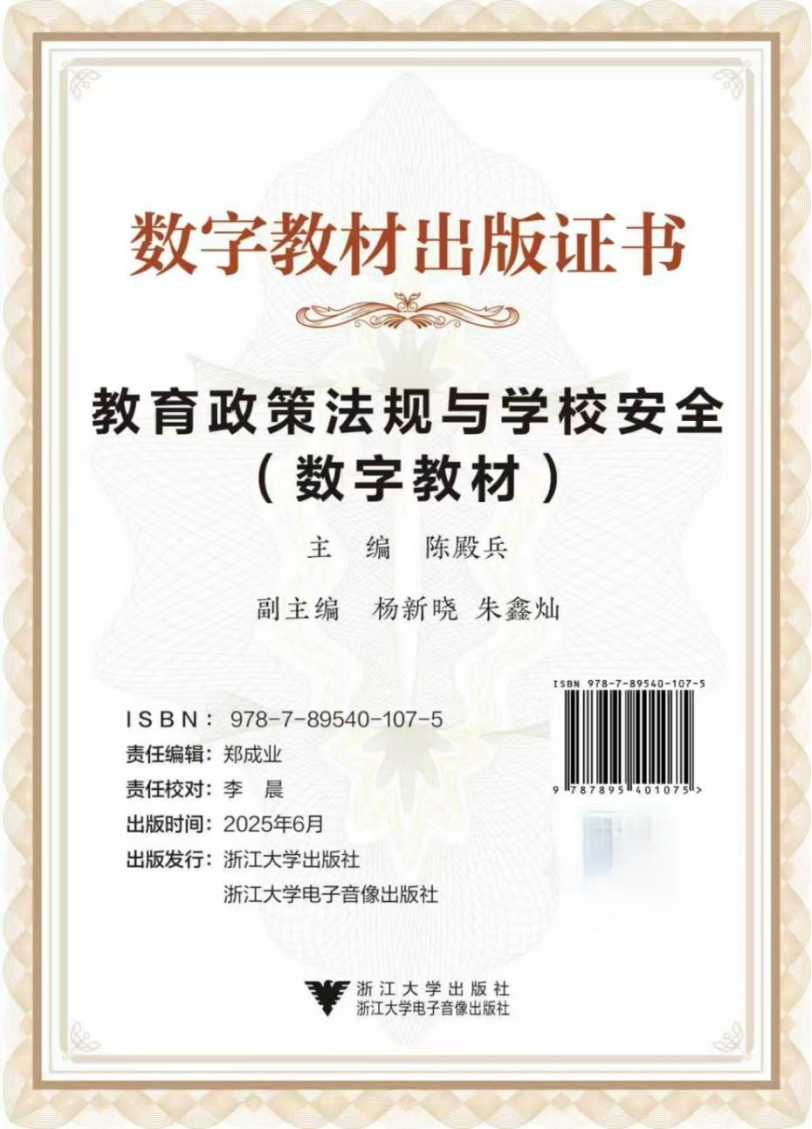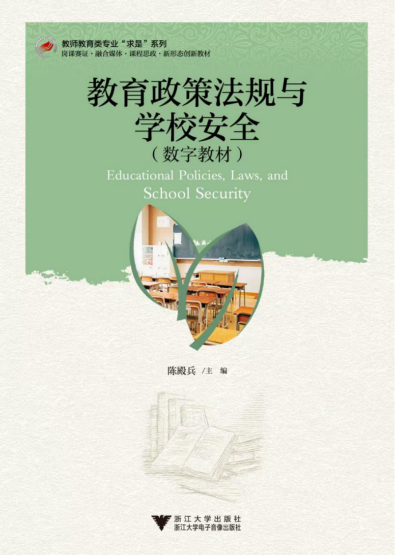 近日,由教育学院(江南娱乐app网站官网 学院)副教授陈殿兵担任主编,副教授杨新晓及研究生朱鑫灿担任副主编的数字教材《教育政策法规与学校安全》,正式由浙江大学出版社、浙江大学电子音像出版社联合出版发行。