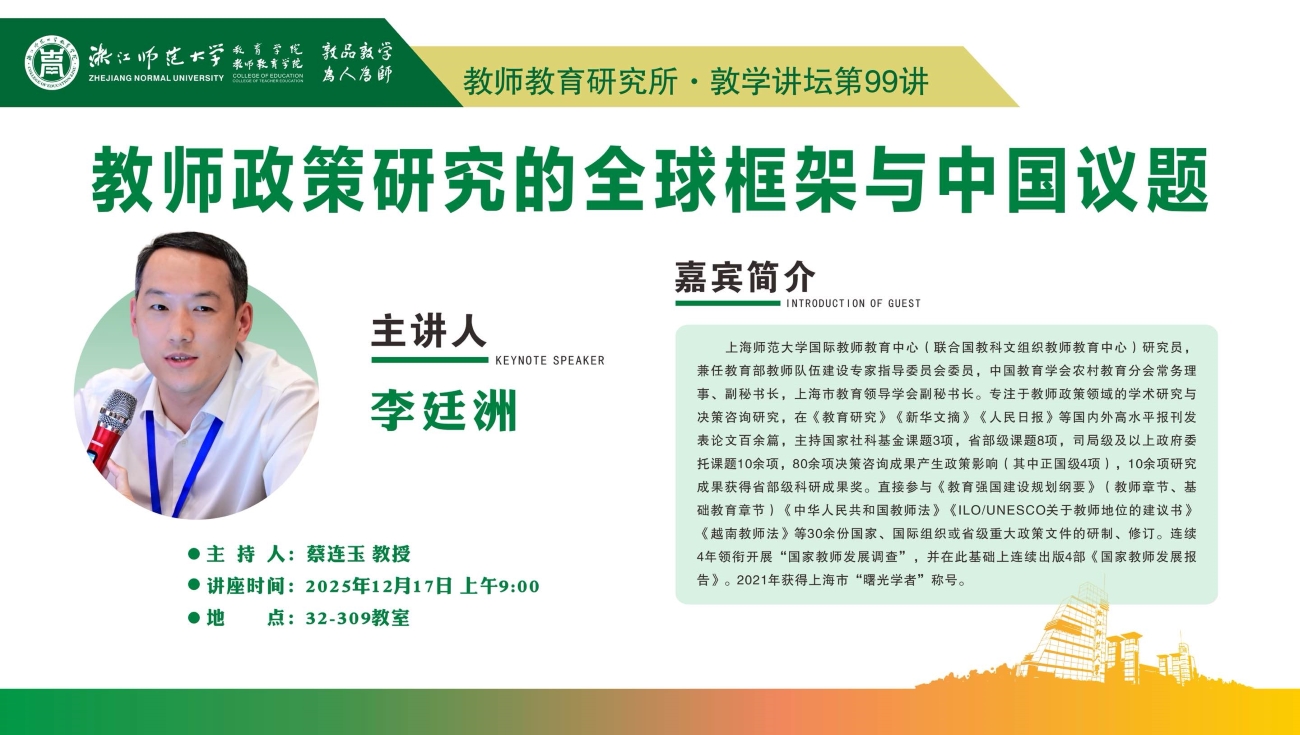 2025年12月17日(周三)上午9:00,上海师范大学国际江南娱乐app网站官网 中心(联合国教科文组织江南娱乐app网站官网 中心)研究员、兼任教育部教师队伍建设专家指导委员会委员、中国教育学会农村教育分会常务理事、副秘书长李廷洲将于32幢309教室,主讲江南娱乐app网站官网 研究所系列讲座暨敦学讲坛第99讲《教师政策研究的全球框架与中国议题》。主持人为蔡连玉教授。