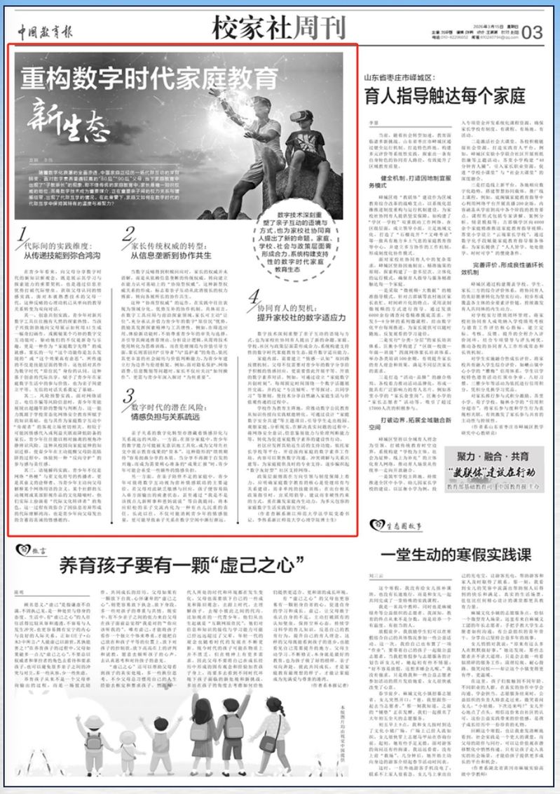 数字技术深刻重塑了亲子互动的语境与方式,也为家校社协同育人提出了新的命题。家庭、学校、社区与政策层面需形成合力,系统构建支持性的数字时代家庭教育生态,提升数字适应能力。
